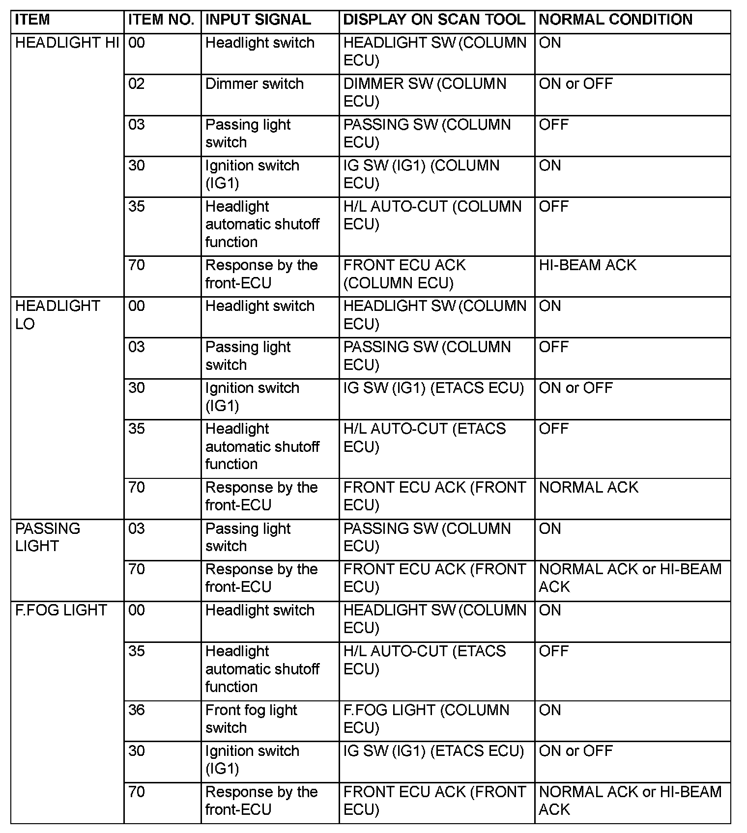 The table shows the service data and their normal condition, which are displayed during the "Data List."