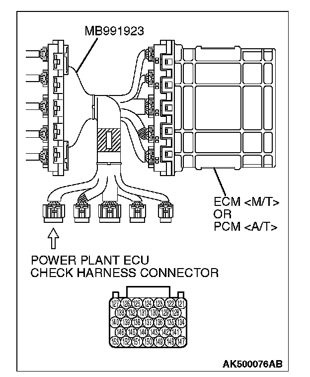 1. Disconnect the EGR valve connector, and connect the test harness special tool (MB991658) between the separated connector (All terminals should be connected).