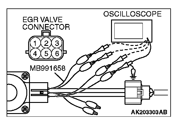 2. Connect the oscilloscope probe to the EGR valve connector terminal No. 1, terminal No. 3, terminal No. 4, terminal No. 6 respectively.