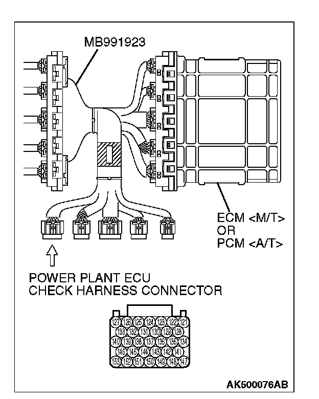 1. Disconnect the camshaft position sensor connector, and connect the test harness special tool (MB991709) between the separated connector (All terminals should be connected).
