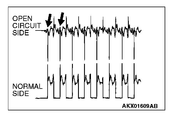 - Current is not supplied to the motor coil on the open circuit side. (Voltage does not drop to 0 volt.) Furthermore, the induced electromotive force wave pattern at the normal side is slightly different from the normal wave pattern.