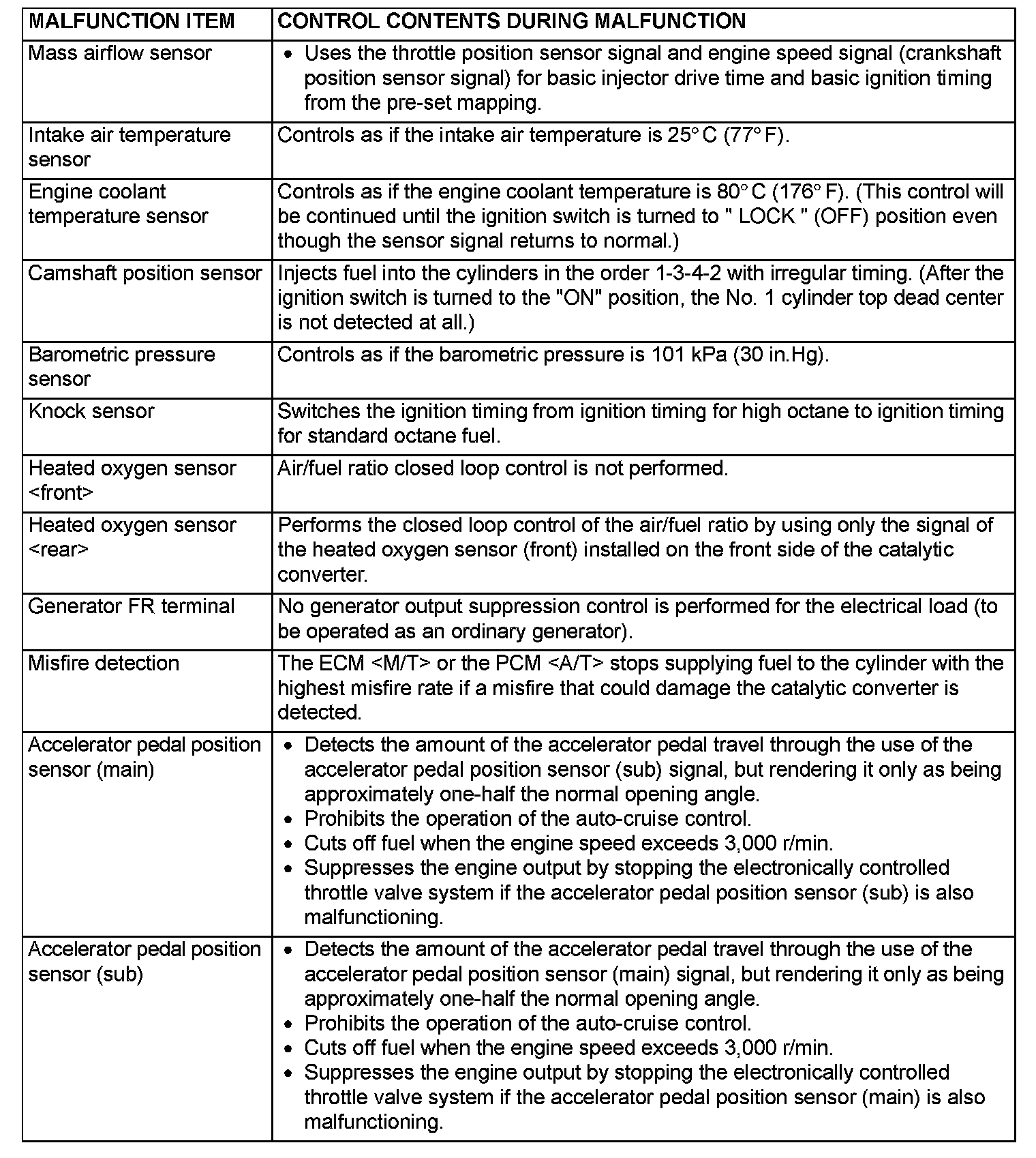 When the main sensor malfunctions are detected by the diagnostic test mode, the vehicle is controlled by means of the following defaults.