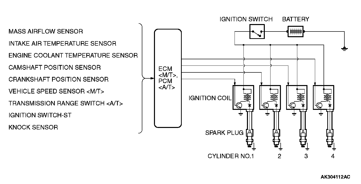 The ECM or PCM determines which ignition coil should be controlled by means of the signals from the camshaft position sensor which is incorporated in the camshaft and from the crankshaft position sensor which is incorporated in the crankshaft.