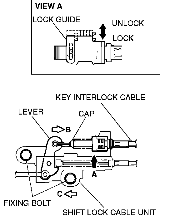 4. Loosen the bolt fixing the shift lock cable unit, push the lever in direction B and the unit in direction C and tighten the bolt at the standard torque.