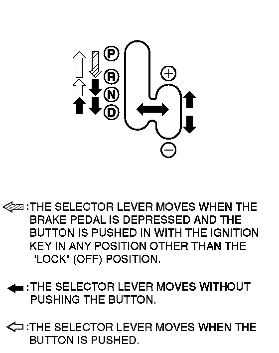 NOTE: The A/T mis-operation prevention mechanism is provided so that the selector lever cannot be moved from the P position if the ignition switch is at a position other than the LOCK (OFF) position and the brake pedal is not depressed.