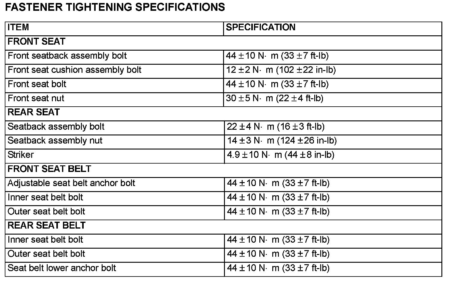 Fastener Tightening Specifications:
