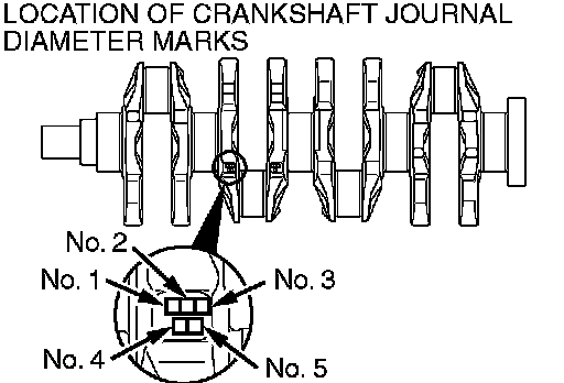 Measure the crankshaft journal diameter and confirm its classification from the following table. In the case of a crankshaft supplied as a service part, identification marks of its journals are stamped at the positions shown in the illustration.