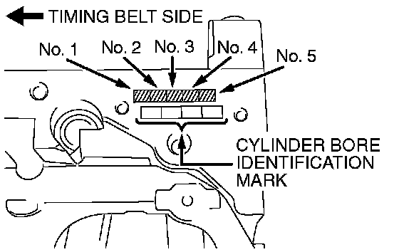 The cylinder block bearing bore diameter identification marks are stamped at the position shown in the illustration from left to right, beginning at No.1.