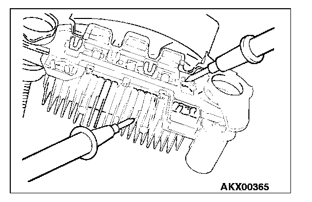 2. Check the continuity between the negative rectifier and the stator coil lead connection terminal with a tester. If there is continuity between the terminals, the diode is grounded, so replace the rectifier.