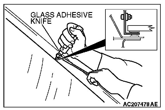 CAUTION: Inserting the glass adhesive knife too deeply into windshield adhesive may damage windshield.
