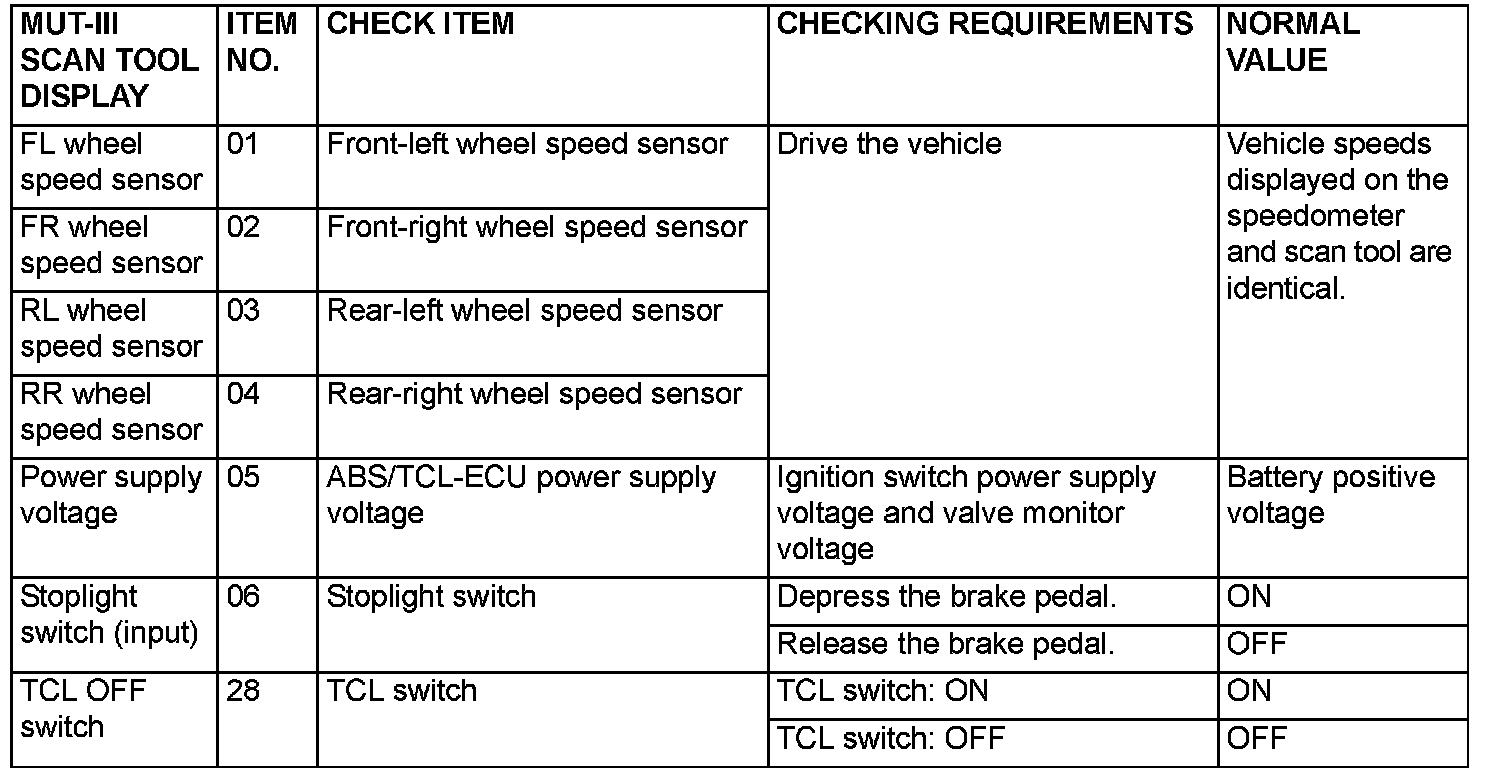 The following items can be read by the scan tool from the ABS/TCL-ECU input data.