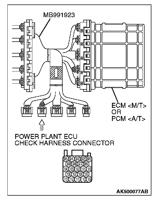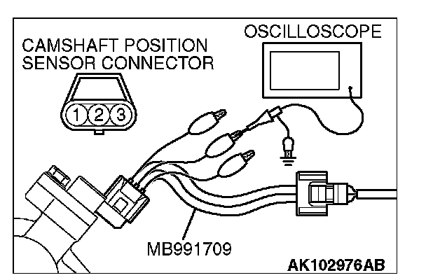 1. Disconnect the camshaft position sensor connector, and connect the test harness special tool (MB991709) between the separated connector (All terminals should be connected).