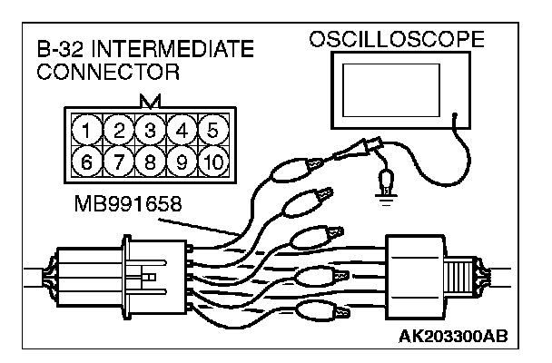 1. Disconnect the intermediate connector B-32, and connect the test harness special tool (MB991658) between the separated connector.