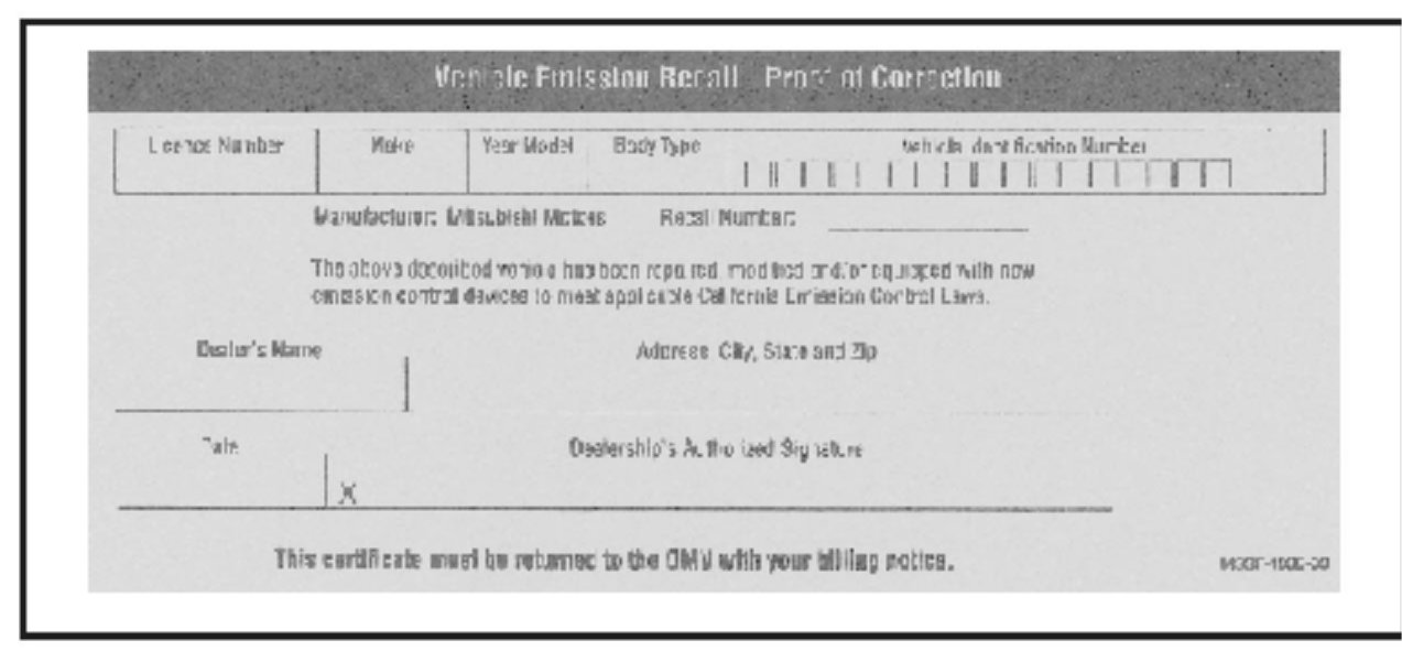 12. FOR VEHICLES REGISTERED IN CALIFORNIA ONLY: Complete a "VEHICLE EMISSION RECALL - PROOF OF CORRECTION" form (p/n MSSF-106D-00). Give the completed form to the vehicle owner.