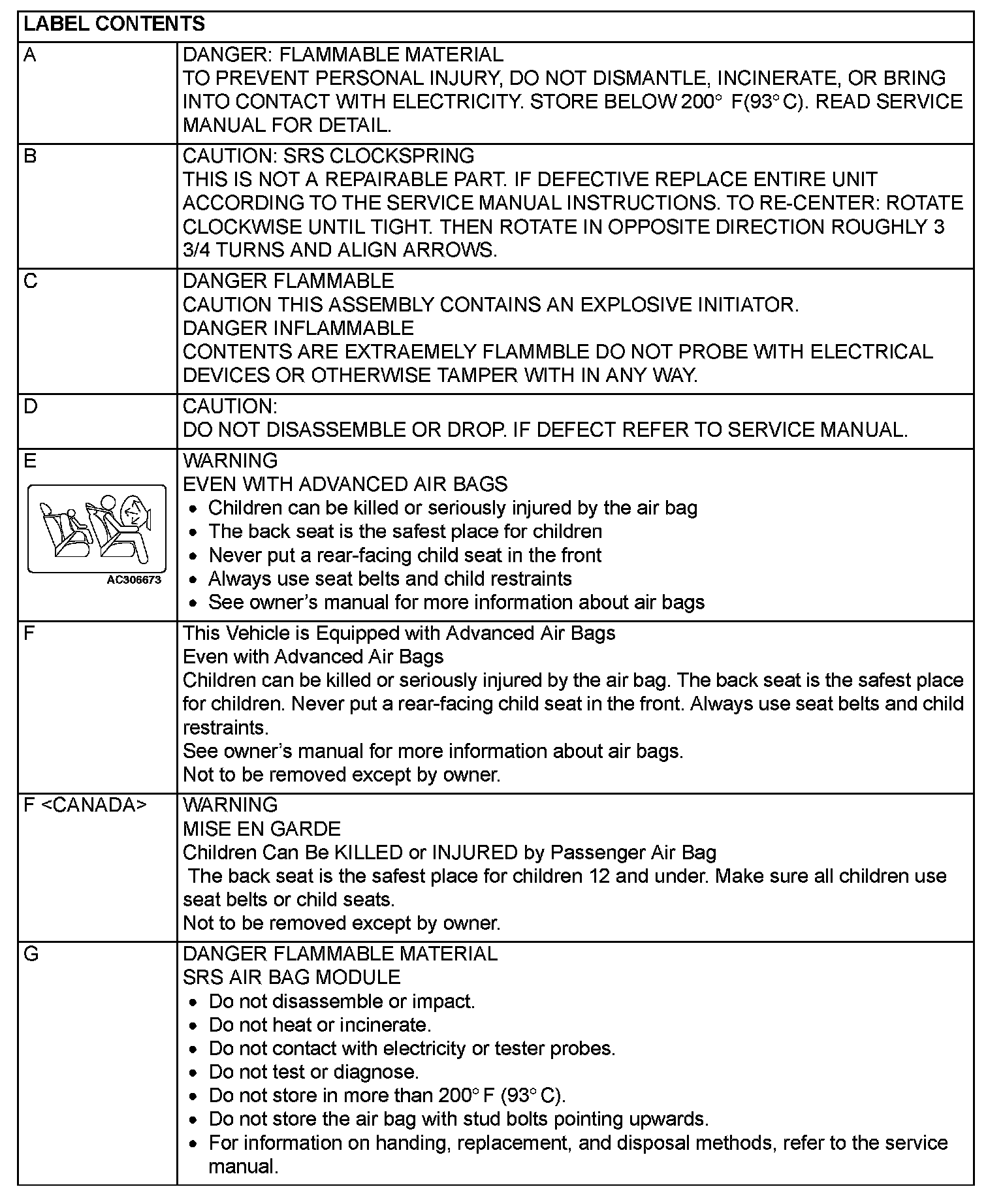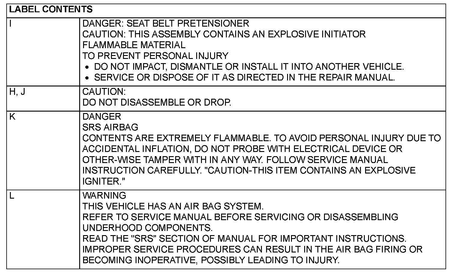 A number of caution labels related to the SRS are found in the vehicle, as shown in the given illustrations. Follow label instructions when servicing SRS. If the labels are dirty or damaged, replace them.