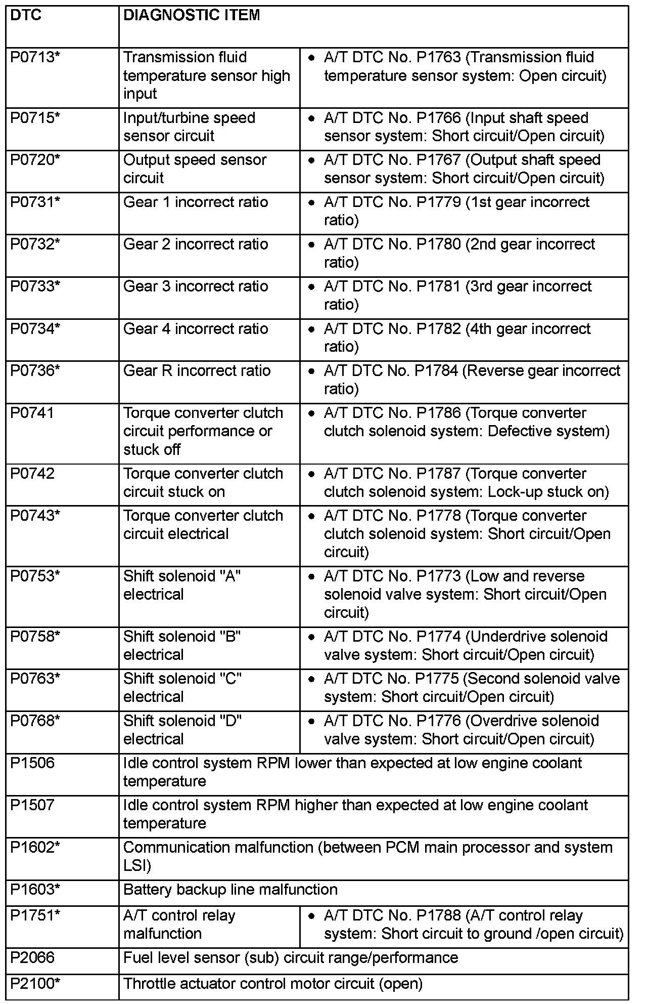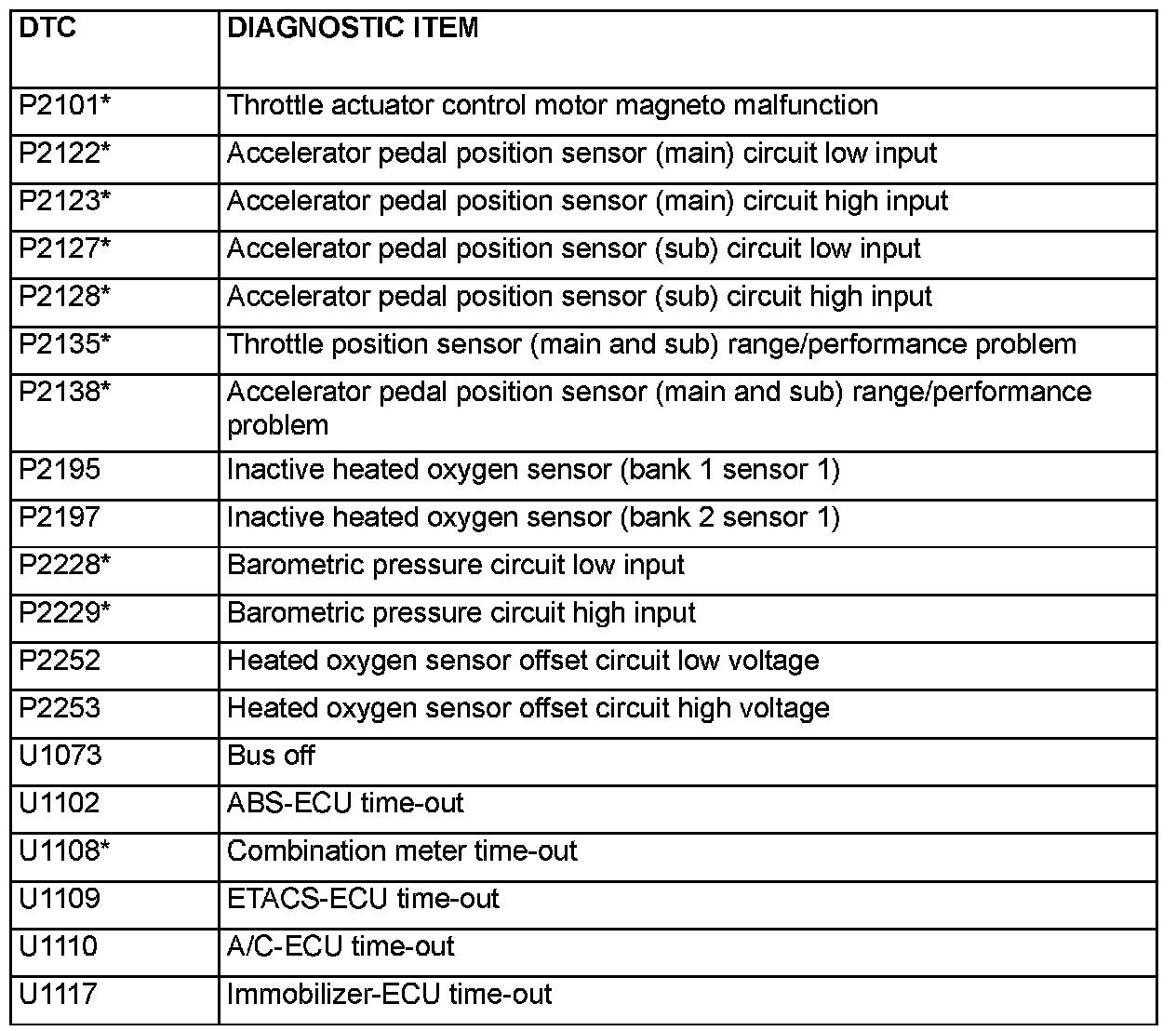 NOTE: After the PCM detects a malfunction, a diagnostic trouble code is recorded the next time the engine is started and the same malfunction is re-detected. However, for items marked with a "* ", the diagnostic trouble code is recorded on the first detection of the malfunction.