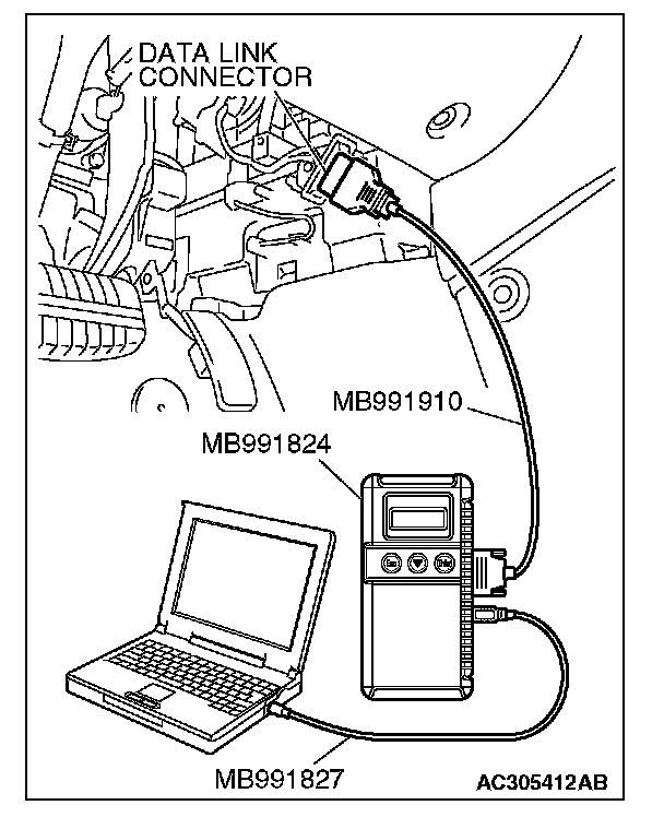 CAUTION: To prevent damage to scan tool MB991958, always turn the ignition switch to the "LOCK" (OFF) position before connecting or disconnecting scan tool MB991958.