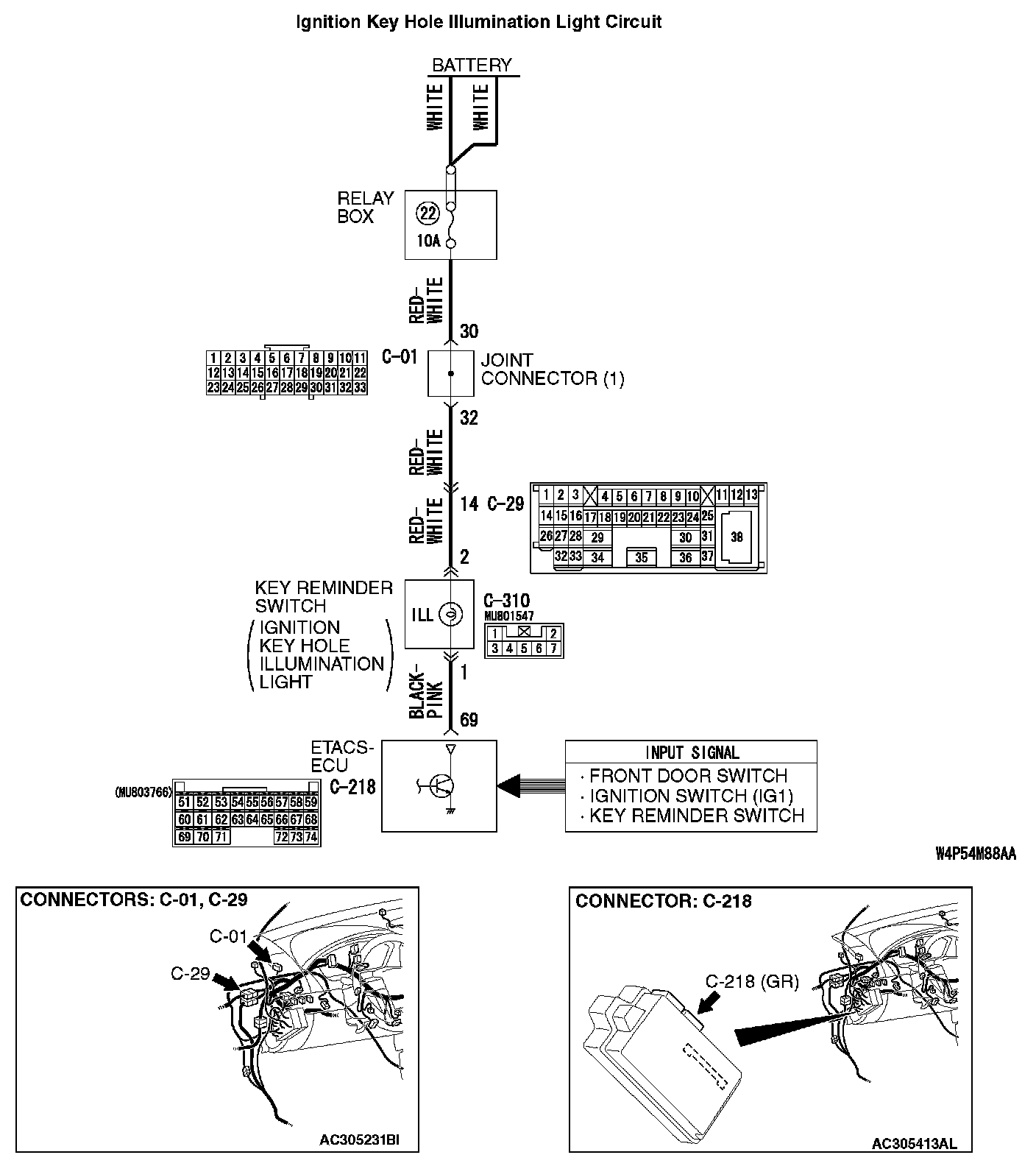 STEP 5. Check at ETACS-ECU connector C-218 in order to check the ignition key hole illumination light circuit.