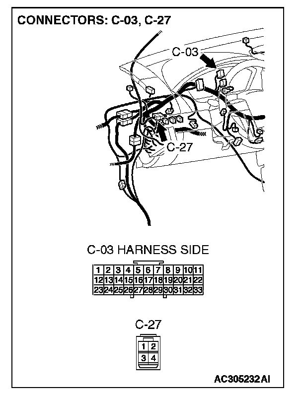 NOTE: Also check intermediate connector C-27 and joint connector C-03. If intermediate connector C-27 or joint connector C-03 is damaged, repair or replace the connector as described in Harness Connector Inspection.