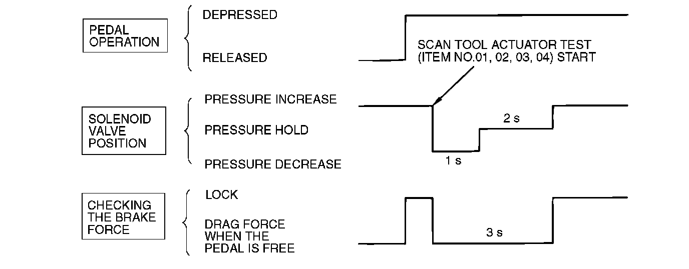 10. Turn the wheel by hand and check the change in braking force when the brake pedal is depressed. When using the braking force tester, depress the brake pedal until the braking force at the following values, and check that the braking force changes to the brake drag force reading taken in step 2 when the actuator is force-driven. The result should be as shown in the diagram above.