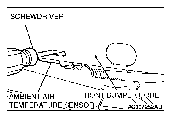 Insert a screwdriver into the mounting hole of the front bumper core to release the clip, and remove the ambient temperature sensor.