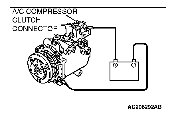 Connect the compressor connector terminal to the battery positive (+) terminal and ground the battery's negative (-) terminal to the compressor unit. At that time, the A/C compressor clutch should make a definite operating sound.