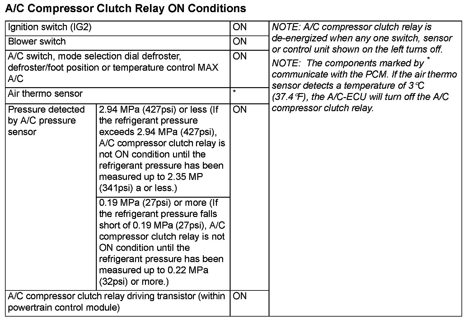 - The dual pressure switch turns OFF when the refrigerant pressure becomes excessively high or low, thus protecting the compressor circuit (See Table)
