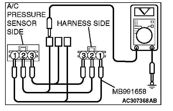 2. Disconnect the A/C pressure sensor connector and connect special tool test harness MB991658 as shown in the illustration.