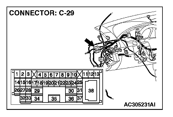 NOTE: Also check intermediate connector C-29 for loose, corroded, or damaged terminals, or terminals pushed back in the connector. If intermediate connector C-29 is damaged, repair or replace the connector as described in Harness Connector Inspection.