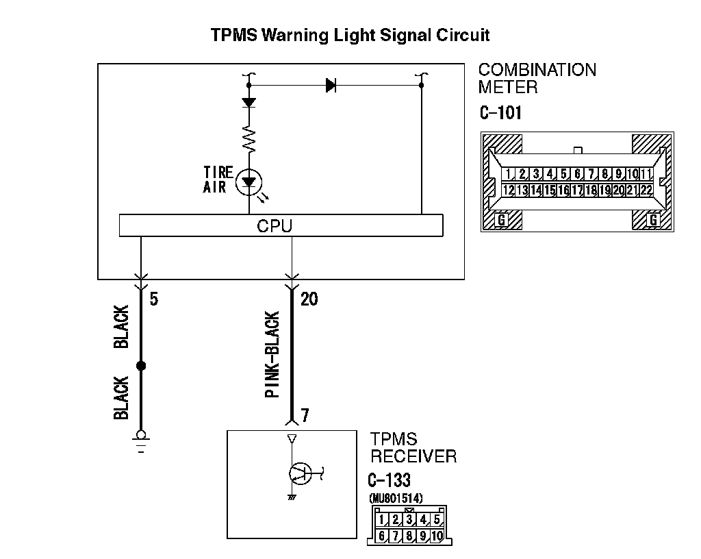 ^ The wire between combination meter connector C-101 (terminal 20) and TPMS receiver connector C-133 (terminal 7)