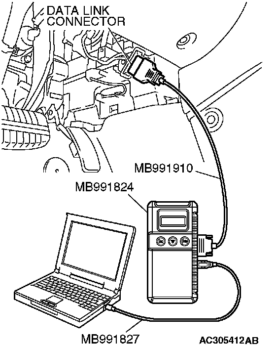CAUTION: To prevent damage to scan tool MB991958, always turn the ignition switch to the "LOCK" (OFF) position before connecting or disconnecting scan tool MB991958.