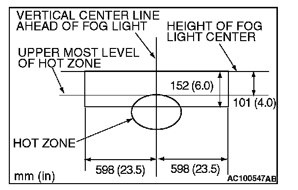 Standard value: (Vertical direction): Top of the hot zone should be 101 mm (40 inches) (076 degrees angle) downward from the height of the fog light center