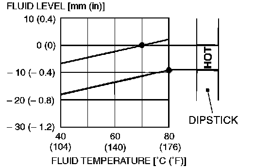 NOTE: If it takes some amount of time until the transmission fluid reaches its normal operating temperature [70 - 80°C (158 - 176°F)], check the transmission fluid level by referring to the left diagram.