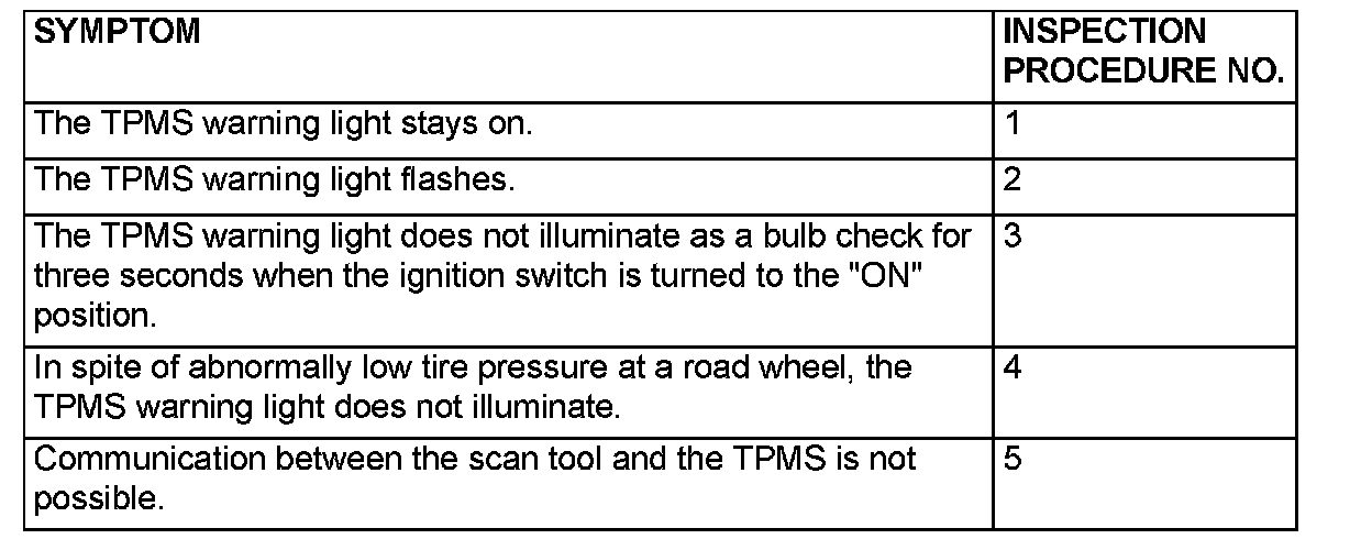 TPMS SYMPTOM CHARTCAUTION: During diagnosis, a DTC code associated with another system may be set when the ignition switch is turned to the "ON" position with connector(s) disconnected. when diagnosis is finished, check all systems for DTC codes. If DTC code(s) are set, erase them all.