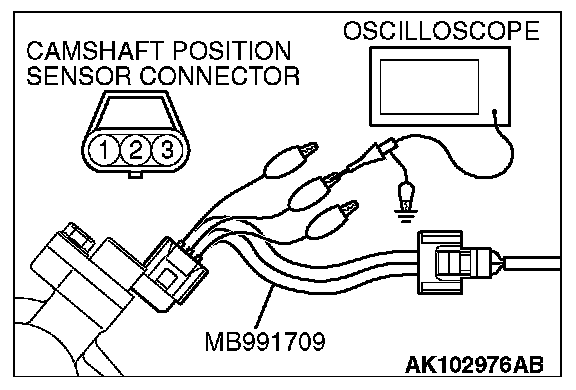 1. Disconnect the camshaft position sensor connector, and connect the test harness special tool (MB991709) between the separated connector (All terminals should be connected).