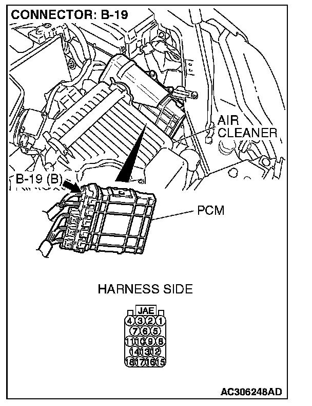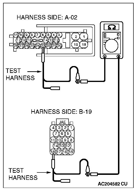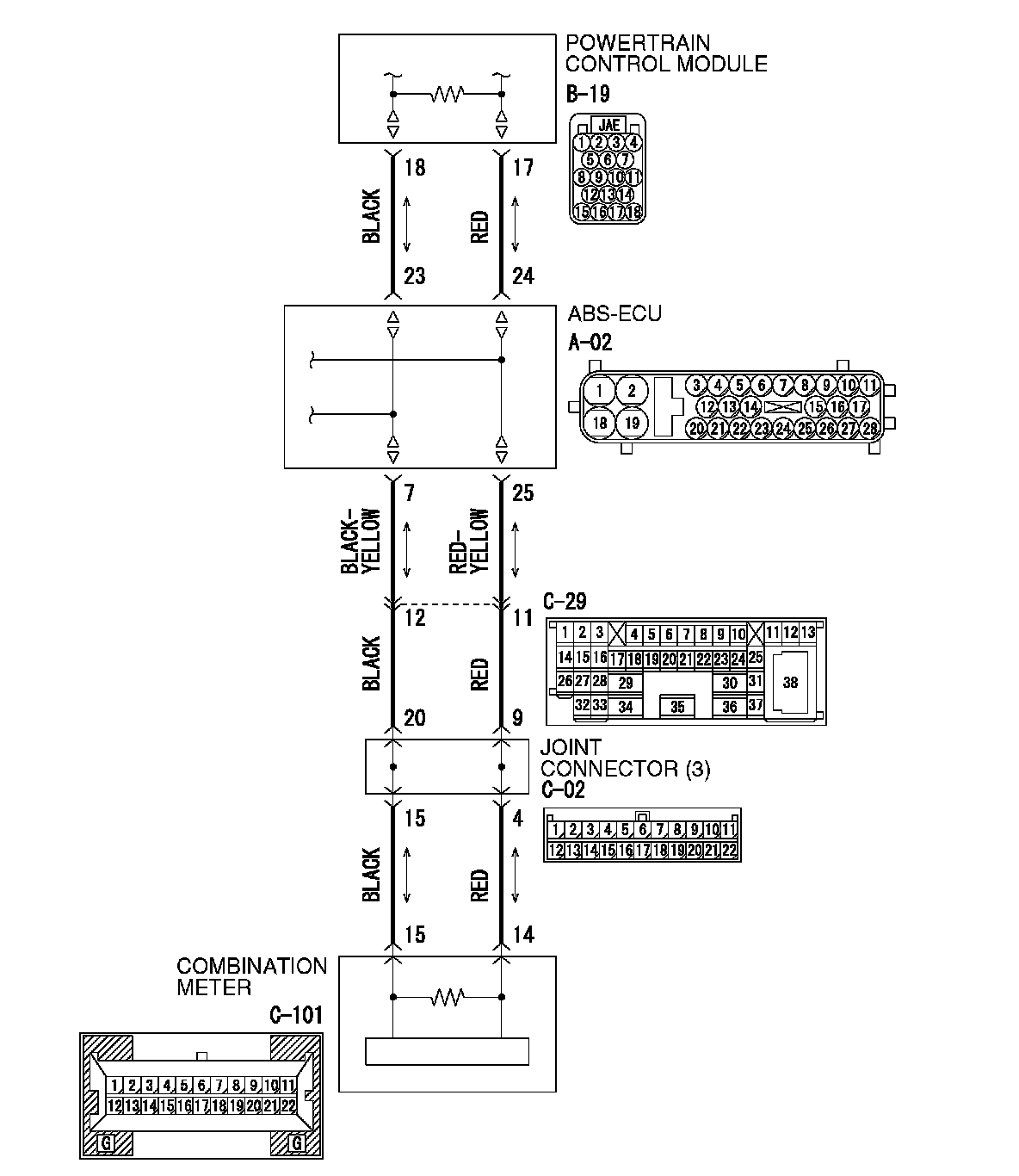 1. Disconnect ABS-ECU connector A-02 and powertrain control module connector B-19, and measure the resistance between each wiring harness side connector.