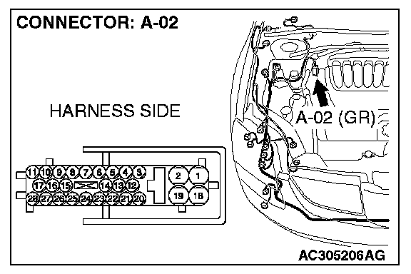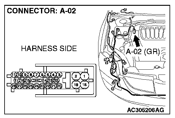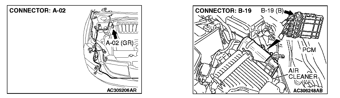 STEP 1. Check ABS-ECU connector A-02 and powertrain control module connector B-19 for loose, corroded or damaged terminals, or terminals pushed back in the connector.