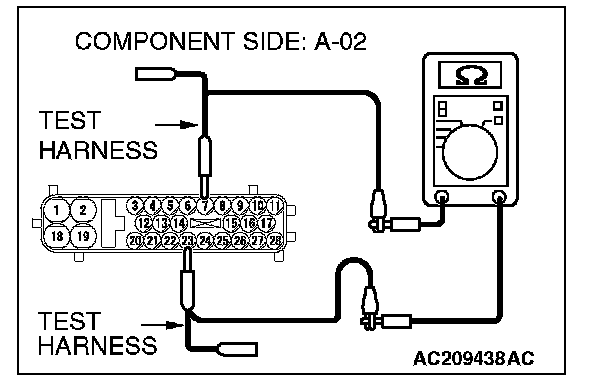 1. Disconnect ABS-ECU connector A-02, and measure the resistance at the component side of ABS-ECU connector A-02.