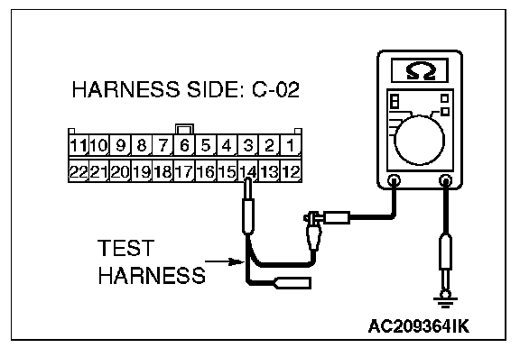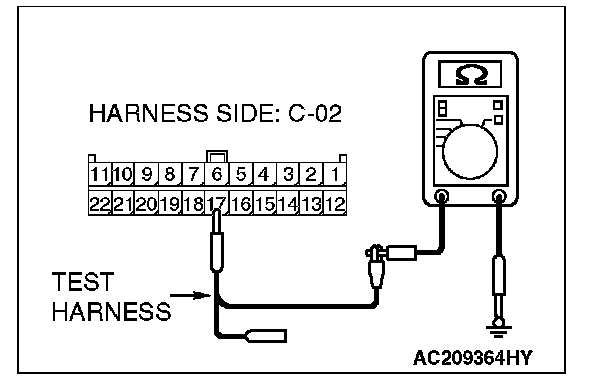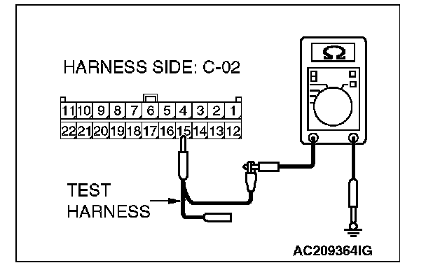 1. Disconnect intermediate connector C-22 and joint connector (3) C-02, and measure the resistance at the wiring harness side of joint connector (3) C-02.
