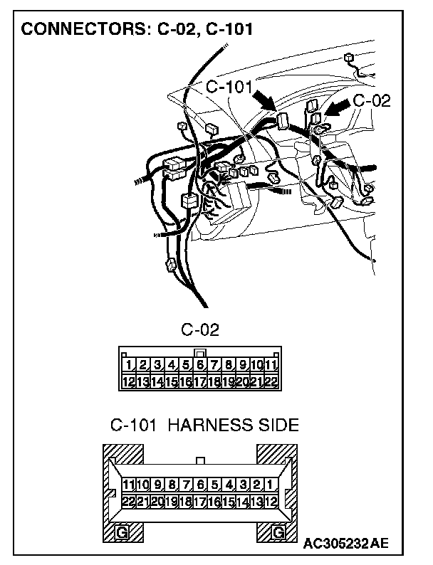 1. Disconnect joint connector (3) C-02 and combination meter connector C-101, and measure the resistance at the wiring harness side of joint connector (3) C-02.