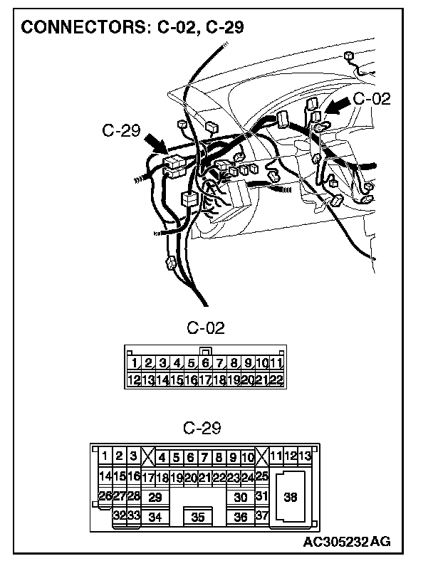 1. Disconnect intermediate connector C-29 and joint connector (3) C-02, and measure the resistance at the wiring harness side of joint connector (3) C-02.
