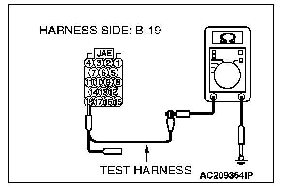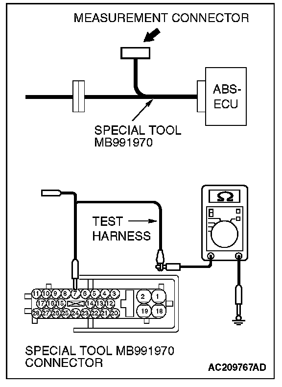2. Connect special tool MB991970 (ABS check harness) to the ABS-ECU and the wiring harness, and measure the resistance at special tool MB991970 (ABS check harness).