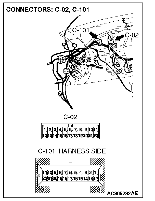 1. Disconnect joint connector (3) C-02 and combination meter connector C-101, and measure the resistance at the wiring harness side of joint connector (3) C-02.