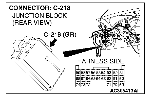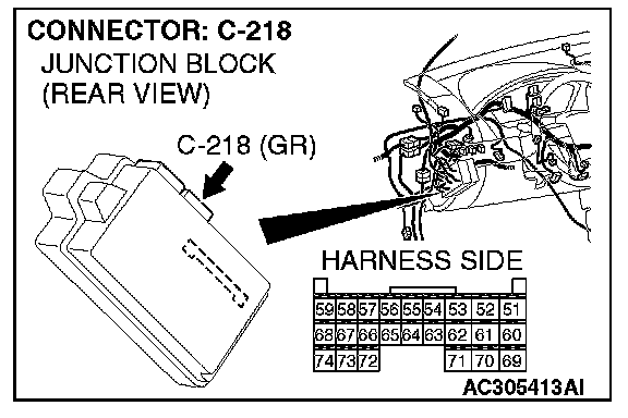 1. Disconnect joint connector (3) C-02 and ETACS-ECU connector C-218, and measure the resistance at the wiring harness side of joint connector (3) C-02.