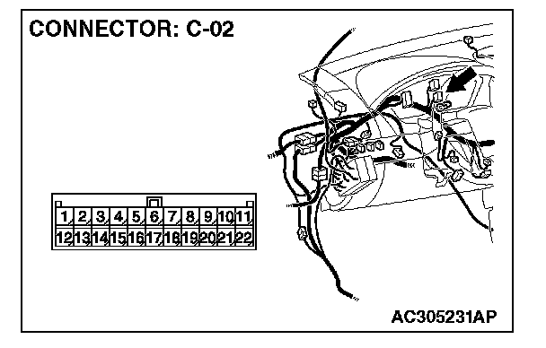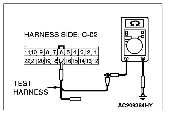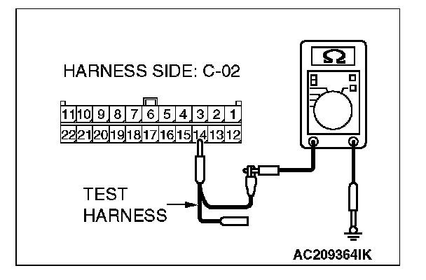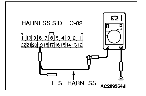 1. Disconnect intermediate connector C-22 and joint connector(3) C-02, and measure the resistance at the wiring harness side of joint connector (3) C-02.