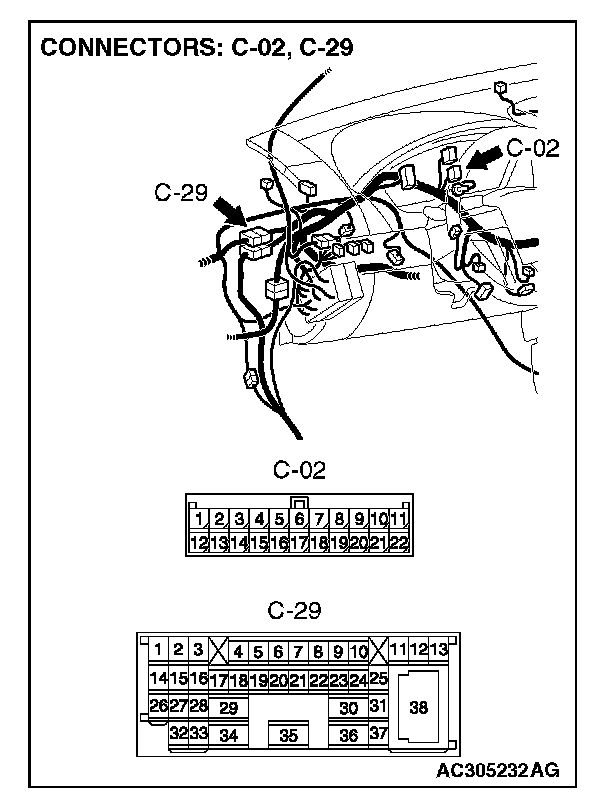 1. Disconnect intermediate connector C-29 and joint connector (3) C-02, and measure the resistance at the wiring harness side of joint connector (3) C-02.