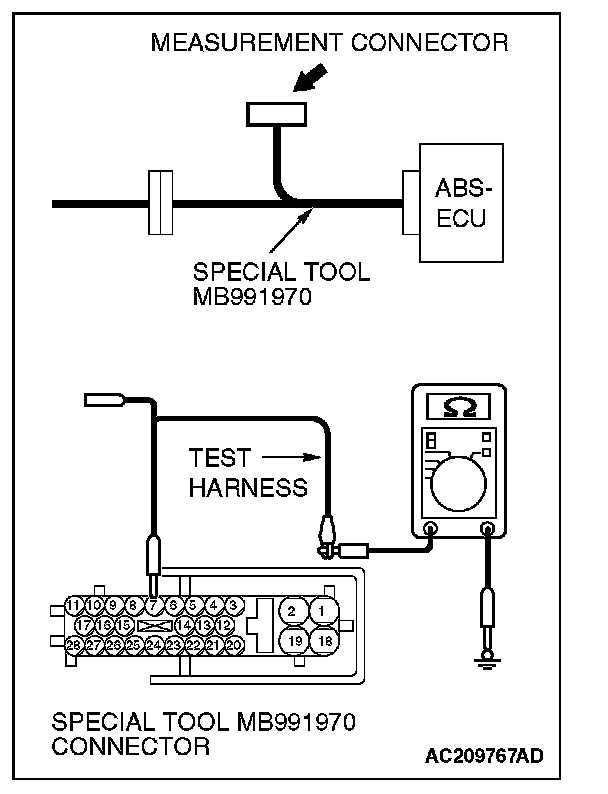2. Connect special tool MB991970 (ABS check harness) to the ABS-ECU and the wiring harness, and measure the resistance at special tool MB991970 (ABS check harness).