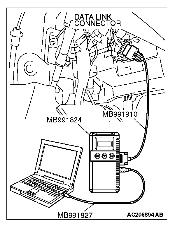 CAUTION: To prevent damage to scan tool MB991958, always turn the ignition switch to the "LOCK" (OFF) position before connecting or disconnecting scan tool MB991958.