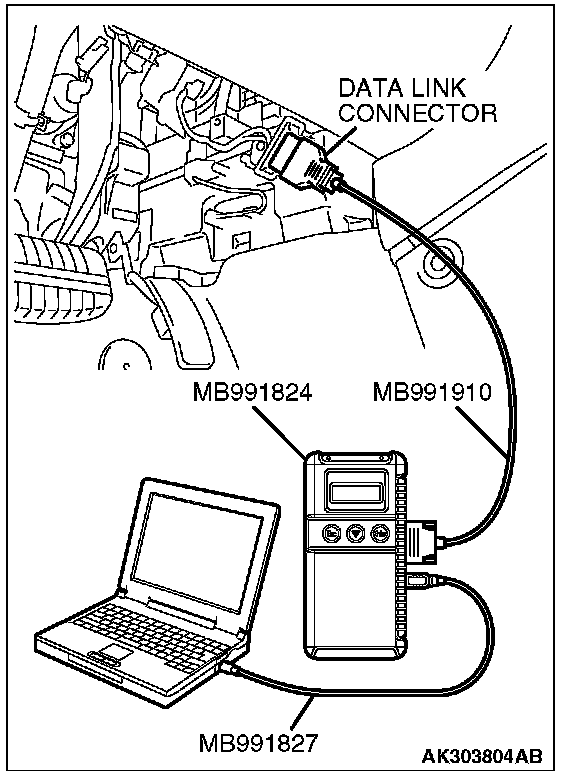 NOTE: Disconnecting the scan tool MB991958 is the reverse of the connecting sequence, making sure that the ignition switch is at the "LOCK" (OFF) position.