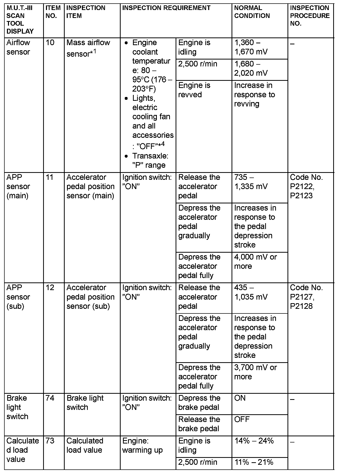 NOTE: *1: In a new vehicle [driven approximately 500 km (311 mile) or less], the mass airflow sensor output value is sometimes 10 percent higher than the standard value.